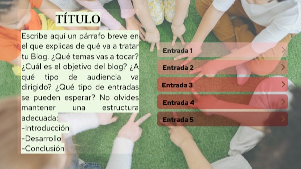 Escribe aquí un párrafo breve en el que explicas de qué va a tratar tu Blog. ¿Qué temas vas a tocar? ¿Cuál es el objetivo del blog? ¿A qué tipo de audiencia va dirigido? ¿Qué tipo de entradas se pueden esperar? No olvides mantener una estructura adecuada: -Introducción -Desarrollo -Conclusión