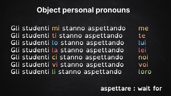 Gli studenti mi stanno aspettando Gli studenti ti stanno aspettando Gli studenti lo stanno aspettando Gli studenti la stanno aspettando Gli studenti ci stanno aspettando Gli studenti vi stanno aspettando Gli studenti li stanno aspettando