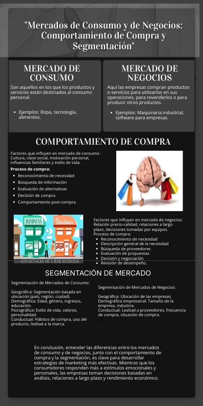 En conclusión, entender las diferencias entre los mercados de consumo y de negocios, junto con el comportamiento de compra y la segmentación, es clave para desarrollar estrategias de marketing más efectivas. Mientras que los consumidores responden más a estímulos emocionales y personales, las empresas toman decisiones basadas en análisis, relaciones a largo plazo y rendimiento económico.