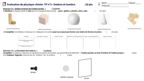 Evaluation de physique-chimie -TP n°3 : Ombres et lumière. /16 pts