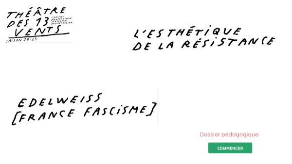 Sylvain Creuzevault examine dans Edelweiss [France Fascisme], présenté au Domaine d'O du 13 au 15 novembre, le camp de la collaboration française pendant la Seconde Guerre mondiale. Réciproquement, L’Esthétique de la résistance reçu au Théâtre des 13 vents les 8 et 9 novembre s’intéresse à la résistance intérieure, allemande, au nazisme.