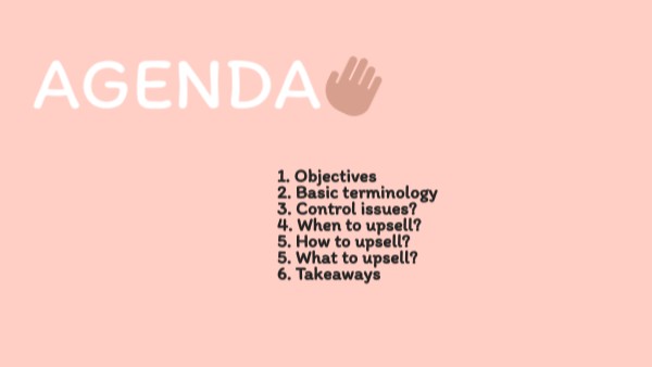 1. Objectives 2. Basic terminology 3. Control issues? 4. When to upsell? 5. How to upsell? 5. What to upsell? 6. Takeaways