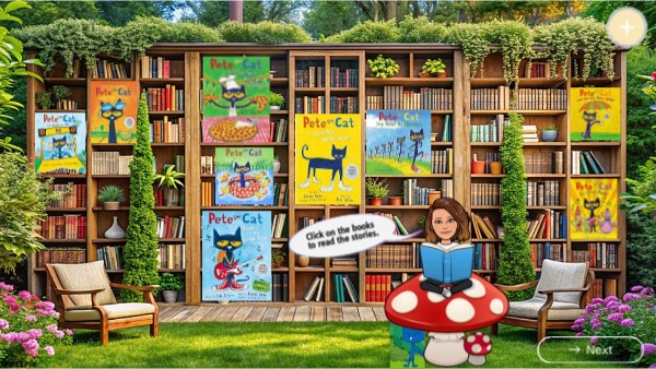 Una colección de libros de Pete the cat en versión video de Youtube con el link directo a la web oficial para acceder a todos sus recursos