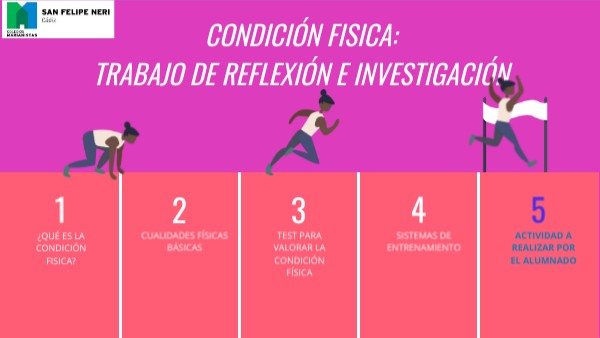 Una vez concluido los test, podemos hacer una reflexión de "como estamos" en relación a nuestra CONDICIÓN FÍSICA. Cada test, está relacionado con una cualidad física, y seguramente, en algunas de ellas, no estemes lo mejor que quisiéramos. El trabajo consiste en REALIZAR UNA INFOGRAFÍA, donde debéis de hablar de los siguientes aspectos: - Definir aquella cualidad física que no estemos bien (elegir una sola). 2,5 puntos - Tipos de esa cualidad. 2,5 puntos. - Beneficios de esa cualidad. 2,5 puntos - Métodos de entrenamiento, para mejorar esa cualidad. 2,5 puntos. OTROS ASPECTOS: - Se valorará la presentación. Restará 2 puntos de la nota final.