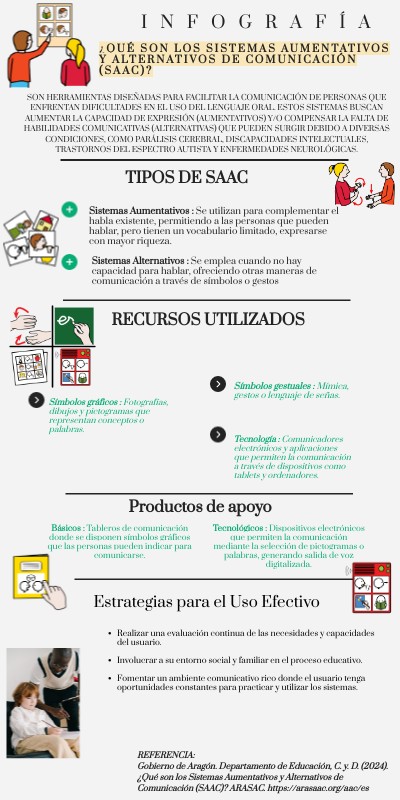 REFERENCIA: Gobierno de Aragón. Departamento de Educación, C. y. D. (2024). ¿Qué son los Sistemas Aumentativos y Alternativos de Comunicación (SAAC)? ARASAC. https://arasaac.org/aac/es