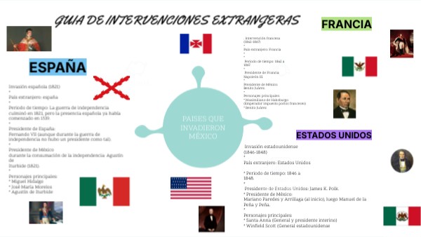 Invasión española (1821) * País extranjero: españa * Periodo de tiempo: La guerra de independencia culminó en 1821, pero la presencia española ya había comenzado en 1519. * Presidente de España: Fernando VII (aunque durante la guerra de independencia no hubo un presidente como tal). * Presidente de México durante la consumación de la independencia: Agustín de Iturbide (1821). * Personajes principales: * Miguel Hidalgo * José María Morelos * Agustín de Iturbide