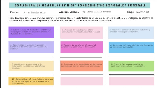Este decálogo establece principios éticos, promueve el consumo responsable y busca democratizar el conocimiento para un desarrollo científico y tecnológico sostenible y equitativo.