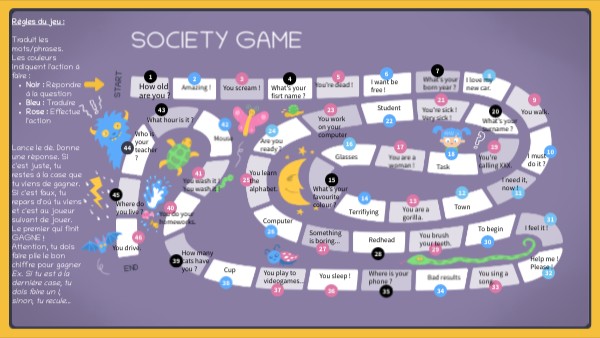 Lance le dé. Donne une réponse. Si c'est juste, tu restes à la case que tu viens de gagner. Si c'est faux, tu repars d'où tu viens et c'est au joueur suivant de jouer. Le premier qui finit GAGNE ! Attention, tu dois faire pile le bon chiffre pour gagner Ex. Si tu est à la dernière case, tu dois faire un 1, sinon, tu recule...SOCIETY GAME