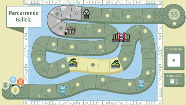 Formaremos catro equipos, cada un terá que elixir unha cor para a súa ficha e o nome de cada equipo será unha das provincias galegas. As regras do xogo son as mesmas que no da Oca, pero con algunha variación, nas casillas que teñen a icona "i" teremos que premer nela e responder a unha pregunta relacionada con Galicia; para ver se a resposta é correcta premeremos na icona con forma de ollo. No caso de non acertar ese equipo quedará unha quenda sen xogar. Gañará o equipo que chegue primeiro a casilla final. CASILLAS ESPECIAIS