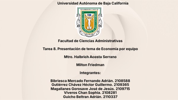 Facultad de Ciencias Administrativas Tarea 8. Presentación de tema de Economía por equipo Mtro. Halbrich Acosta Serrano Milton Friedman Integrantes: Bibriesca Mercado Fernando Adrián. 2108588 Gutiérrez Chávez Héctor Guillermo. 2109365 Magallanes Gorosave José de Jesús. 2109715 Viveros Chan Sophia. 2108281 Guicho Beltran Adrián. 2110337