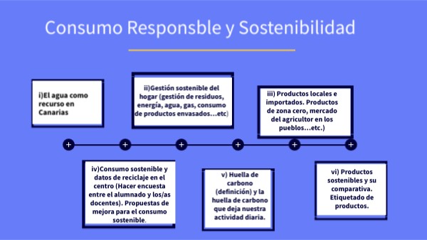a) Impacto Ambiental de los Productos Importados: Investigar la huella de carbono de los productos que recorren grandes distancias para llegar a Canarias, desde el transporte hasta el envasado adicional requerido para su conservación. b) Beneficios de los Productos de Kilómetro Cero: Explicar cómo consumir productos locales y de kilómetro cero contribuye a reducir las emisiones de CO2 y apoya la economía local, promoviendo una conexión más cercana entre productores y consumidores. c) Estacionalidad de los Productos Locales: Analizar la importancia de consumir frutas, verduras y otros alimentos de temporada para reducir la necesidad de transporte y refrigeración, lo que disminuye el impacto ambiental. d) Apoyo a la Economía Local: Estudiar cómo el consumo de productos locales fortalece la economía de las islas, fomenta el empleo en sectores agrícolas y artesanales, y preserva tradiciones y conocimientos locales. e) Comparativa de Precios y Sostenibilidad: Reflexionar sobre cómo los precios de los productos importados a veces son menores que los locales debido a subsidios o producción a gran escala, pero con un mayor coste ambiental. Evaluar la relación entre precio y sostenibilidad. f) Seguridad y Calidad Alimentaria: Explorar cómo los productos locales pueden ser más frescos y tener menos conservantes que los importados, lo que puede resultar en beneficios para la salud y una menor necesidad de embalaje. g) Conciencia y Educación sobre Productos Locales: Proponer actividades para que los estudiantes exploren y conozcan la oferta de productos locales en mercados o ferias, fomentando la educación sobre la sostenibilidad en sus propias decisiones de consumo.