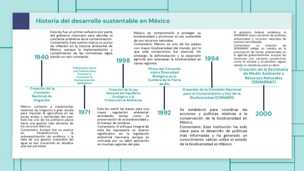 Comentarios Personales El desarrollo sustentable en México ha sido un proceso marcado por avances importantes en materia legislativa y de políticas públicas. Sin embargo, la implementación de estas leyes ha sido desigual y en muchos casos, insuficiente. A lo largo del tiempo, México ha mostrado un compromiso en la arena internacional, pero en la práctica interna ha enfrentado obstáculos como la corrupción, la falta de recursos y los intereses económicos que priorizan el crecimiento a corto plazo sobre la sostenibilidad a largo plazo.