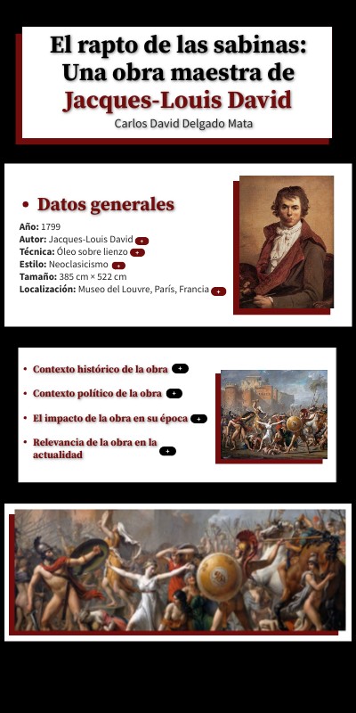 Jacques-Louis David fue un pintor francés del siglo XVIII, líder del Neoclasicismo. Conocido por obras como El Juramento de los Horacios, La Muerte de Sócrates y El rapto de las sabinas, reflejó ideales de patriotismo, moral y virtud. Fue un importante artista de la Revolución Francesa y retratista de Napoleón.
