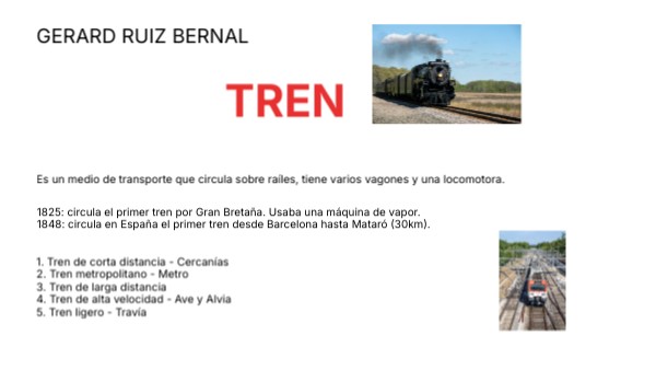 1. Tren de corta distancia - Cercanías 2. Tren metropolitano - Metro 3. Tren de larga distancia 4. Tren de alta velocidad - Ave y Alvia 5. Tren ligero - Travía