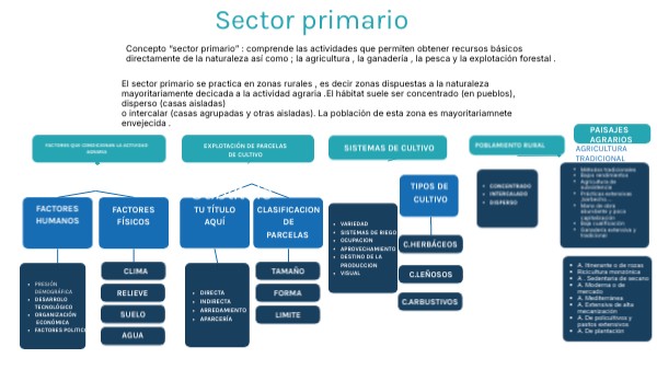 El sector primario se practica en zonas rurales , es decir zonas dispuestas a la naturaleza mayoritariamente decicada a la actividad agraria .El hábitat suele ser concentrado (en pueblos), disperso (casas aisladas) o intercalar (casas agrupadas y otras aisladas). La población de esta zona es mayoritariamnete envejecida .