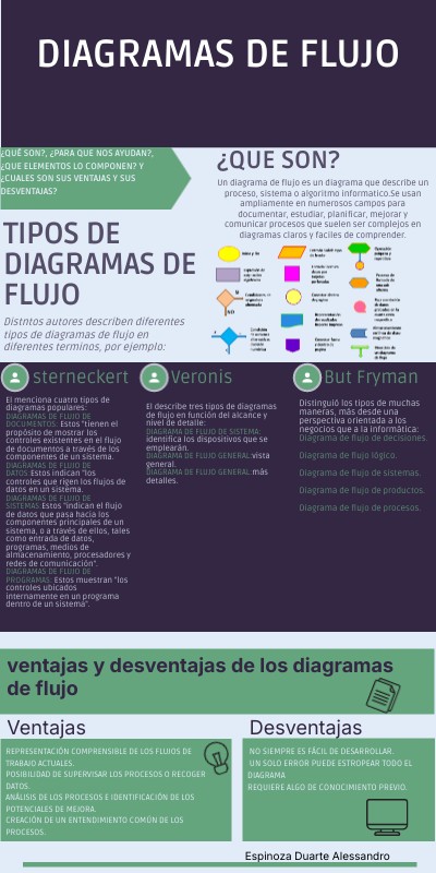 El menciona cuatro tipos de diagramas populares:DIAGRAMAS DE FLUJO DE DOCUMENTOS: Estos "tienen el propósito de mostrar los controles existentes en el flujo de documentos a través de los componentes de un sistema. DIAGRAMAS DE FLUJO DE DATOS:Estos indican "los controles que rigen los flujos de datos en un sistema. DIAGRAMAS DE FLUJO DE SISTEMAS:Estos "indican el flujo de datos que pasa hacia los componentes principales de un sistema, o a través de ellos, tales como entrada de datos, programas, medios de almacenamiento, procesadores y redes de comunicación". DIAGRAMAS DE FLUJO DE PROGRAMAS: Estos muestran "los controles ubicados internamente en un programa dentro de un sistema".