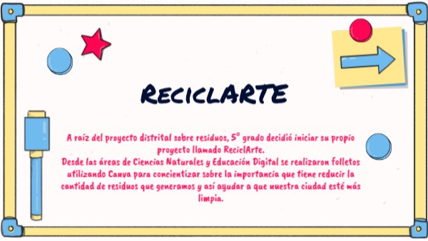 A raíz del proyecto distrital sobre residuos, 5° grado decidió iniciar su propio proyecto llamado ReciclArte. Desde las áreas de Ciencias Naturales y Educación Digital se realizaron folletos utilizando Canva para concientizar sobre la importancia que tiene reducir la cantidad de residuos que generamos y así ayudar a que nuestra ciudad esté más limpia.