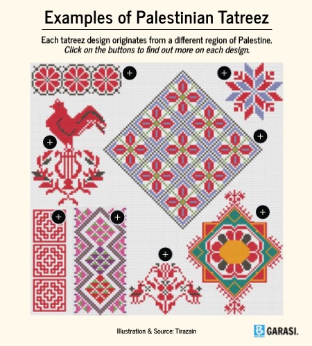 Each tatreez design originates from a different region of Palestine. Click on the buttons to find out more on each design.