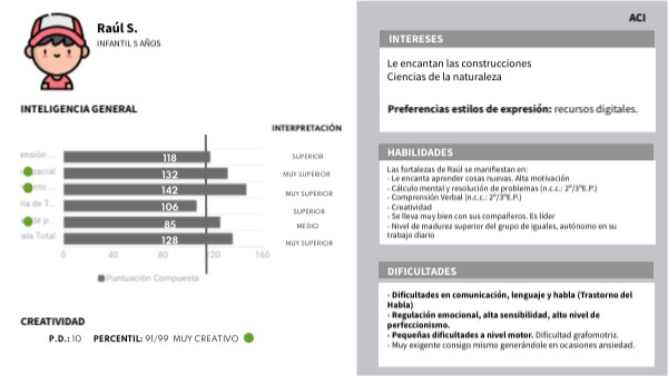 Las fortalezas de Raúl se manifiestan en: - Le encanta aprender cosas nuevas. Alta motivación - Cálculo mental y resolución de problemas (n.c.c.: 2º/3ºE.P.) - Comprensión Verbal (n.c.c.: 2º/3ºE.P.) - Creatividad - Se lleva muy bien con sus compañeros. Es líder - Nivel de madurez superior del grupo de iguales, autónomo en su trabajo diario