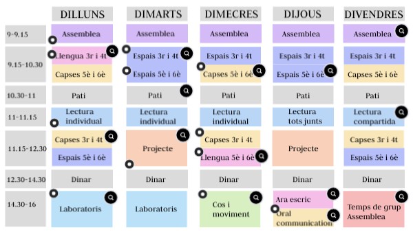 A través del consell escolar i dels i les representants de cada grup, s'ha proposat un "menú de patis", on es recullen diverses propostes per poder aprofitar al màxim el potencial de l'espai del pati cada dia de la setmana. El pati té un espai de joc més mogut i l'espai de calma. El menú contempla propostes per ambdós. Algunes d'aquestes propostes, per exemple, inclouen posar música, jugar al pica paret, escacs, llibres, cordes, etc.