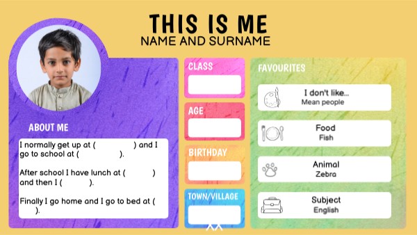 I normally get up at ( ) and I go to school at ( ). After school I have lunch at ( ) and then I ( ). Finally I go home and I go to bed at ( ).
