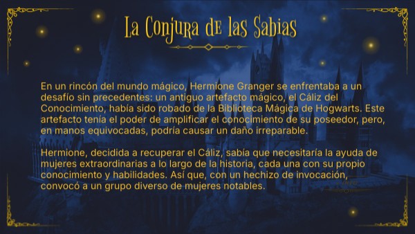 En un rincón del mundo mágico, Hermione Granger se enfrentaba a un desafío sin precedentes: un antiguo artefacto mágico, el Cáliz del Conocimiento, había sido robado de la Biblioteca Mágica de Hogwarts. Este artefacto tenía el poder de amplificar el conocimiento de su poseedor, pero, en manos equivocadas, podría causar un daño irreparable. Hermione, decidida a recuperar el Cáliz, sabía que necesitaría la ayuda de mujeres extraordinarias a lo largo de la historia, cada una con su propio conocimiento y habilidades. Así que, con un hechizo de invocación, convocó a un grupo diverso de mujeres notables.