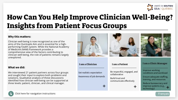 Cite: Salimi, D., Poirier, M.-D., Lussier, S., Moncado, J., & Bush, P. L. (2025). How Can You Help Improve Clinician Well-Being? Insights from Patient Focus Groups [Interactive presentation]. Genially. https://view.genially.com/6716580318e2a1eeb9f7ef59