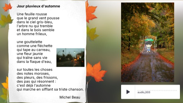 Jour pluvieux d'automne Une feuille rousse que le grand vent pousse dans le ciel gris-bleu, l'arbre nu qui tremble et dans le bois semble un homme frileux, une gouttelette comme une fléchette qui tape au carreau, une fleur jaunie qui traîne sans vie dans la flaque d'eau, sur toutes les choses des notes moroses, des pleurs, des frissons, des pas qui résonnent : c'est déjà l'automne qui marche en sifflant sa triste chanson. Michel Beau
