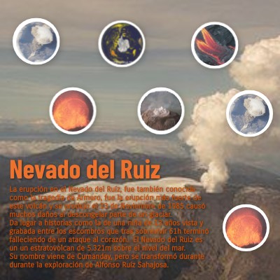 La erupción en el Nevado del Ruíz, fue también conocida como la tragedia de Armero, fue la erupción más fuerte de este volcán y se produjo el 13 de Noviembre de 1985 causó muchos daños al descongelar parte de un glaciar. Da lugar a historias como la de una niña de 13 años vista y grabada entre los escombros que tras sobrevivir 61h terminó falleciendo de un ataque al corazón. El Nevado del Ruiz es un un estratovolcan de 5.321m sobre el nivel del mar. Su nombre viene de Cumanday, pero se transformó durante durante la exploración de Alfonso Ruíz Sahajosa.