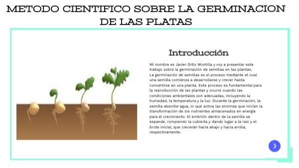 Mi nombre es Javier Ortiz Montilla y voy a presentar este trabajo sobre la germinación de semillas en las plantas. La germinación de semillas es el proceso mediante el cual una semilla comienza a desarrollarse y crecer hasta convertirse en una planta. Este proceso es fundamental para la reproducción de las plantas y ocurre cuando las condiciones ambientales son adecuadas, incluyendo la humedad, la temperatura y la luz. Durante la germinación, la semilla absorbe agua, lo que activa las enzimas que inician la transformación de los nutrientes almacenados en energía para el crecimiento. El embrión dentro de la semilla se expande, rompiendo la cubierta y dando lugar a la raíz y el brote inicial, que crecerán hacia abajo y hacia arriba, respectivamente.