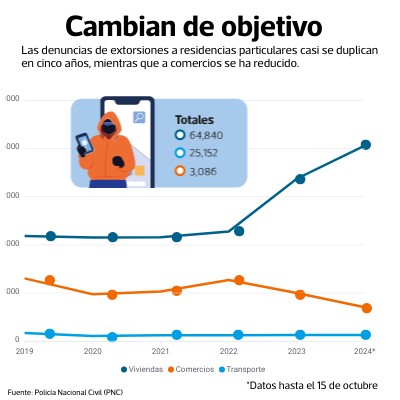 Las denuncias de extorsiones a residencias particulares casi se duplican en cinco años, mientras que a comercios se ha reducido.