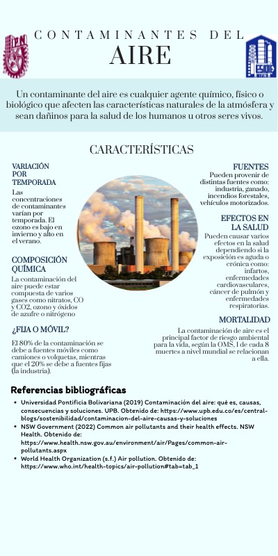 - Universidad Pontificia Bolivariana (2019) Contaminación del aire: qué es, causas, consecuencias y soluciones. UPB. Obtenido de: https://www.upb.edu.co/es/central-blogs/sostenibilidad/contaminacion-del-aire-causas-y-soluciones