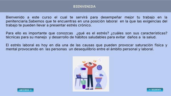 Bienvenido a este curso el cual te servirá para desempeñar mejor tu trabajo en la penitenciaria.Sabemos que te encuentras en una posición laboral en la que las exigencias del trabajo te pueden llevar a presentar estrés crónico.Para ello es importante que conozcas ¿qué es el estrés? ¿cuáles son sus características? técnicas para su manejo y desarrollo de hábitos saludables para evitar daños a la salud. El estrés laboral es hoy en día una de las causas que pueden provocar saturación física y mental provocando en las personas un desequilibrio entre el ámbito personal y laboral.