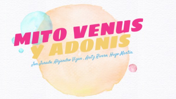 Venus es la chica que hace con Adonis que es el chico y juntos hacen esta gran mito (HISTORIA) Venus era la diosa romana del Amor, la belleza y la fertilidad. También era la protectora de la naturaleza y los jardines muy bella y dulce chica con la que se casó Adonis. Adonis nació de los amores incestuosos de Mirra, hija de Cíniras (o Tías), rey de Chipre, con su propio padre, al que engañó bajo una falsa apariencia. Este, al descubrir el engaño, intentó matar a su hija, pero ella huyó y pidió ayuda a los dioses, que la convirtieron en un árbol, el árbol de la mirra es y era un gran chico con muy buena inteligencia y cariño. Tanbién sin caracter y muy majo.