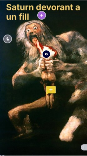 Aquesta obra té el titol de "Saturn devorant un fill". l'autor és "Francisco de Goya", que va pintar l'obra entre el 1819 i el 1823. Actualment, l'obra és troba al "Museo del Prado", Madrid. L'obra va ser pintada amb oli sobre arrebossat i després va ser traslladada a llenç. L'obra representa un tema mitològic sobre Saturn(Cronos a la mitología Grega) devorant un fill perque no l'hi destroni. L'escena es dramàtica i violenta. Representa Saturn en un acte caníbal, devorant el cos d'un dels seus fills. Els seus ulls estàn plens de desesperació i bogerìa , les eves mans mig desmembrant el cos.