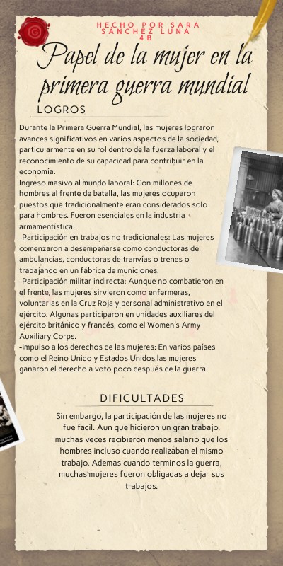 Durante la Primera Guerra Mundial, las mujeres lograron avances significativos en varios aspectos de la sociedad, particularmente en su rol dentro de la fuerza laboral y el reconocimiento de su capacidad para contribuir en la economía. Ingreso masivo al mundo laboral: Con millones de hombres al frente de batalla, las mujeres ocuparon puestos que tradicionalmente eran considerados solo para hombres. Fueron esenciales en la industria armamentística. -Participación en trabajos no tradicionales: Las mujeres comenzaron a desempeñarse como conductoras de ambulancias, conductoras de tranvías o trenes o trabajando en un fábrica de municiones. -Participación militar indirecta: Aunque no combatieron en el frente, las mujeres sirvieron como enfermeras, voluntarias en la Cruz Roja y personal administrativo en el ejército. Algunas participaron en unidades auxiliares del ejército británico y francés, como el Women's Army Auxiliary Corps. -Impulso a los derechos de las mujeres: En varios países como el Reino Unido y Estados Unidos las mujeres ganaron el derecho a voto poco después de la guerra.