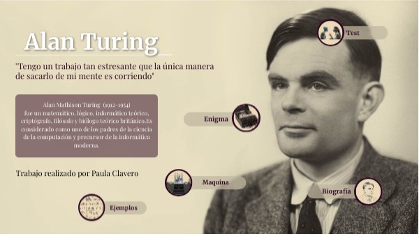 Alan Mathison Turing (1912-1954) fue un matemático, lógico, informático teórico, criptógrafo, filósofo y biólogo teórico británico.Es considerado como uno de los padres de la ciencia de la computación y precursor de la informática moderna.