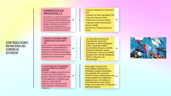 Impuesto General de Importación (IGI) Impuesto al Valor Agregado (IVA) Impuesto Especial sobre Producción y Servicios (IEPS) Impuesto Sobre Automóviles Nuevos (ISAN) Derecho de Trámite Aduanero (DTA)