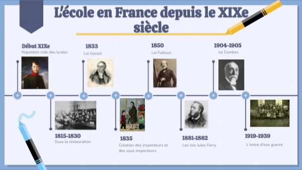 - Sécularisation de l'école, instruction obligatoire pour tous les enfants de 6 à 13 ans, création de l'école maternelle.