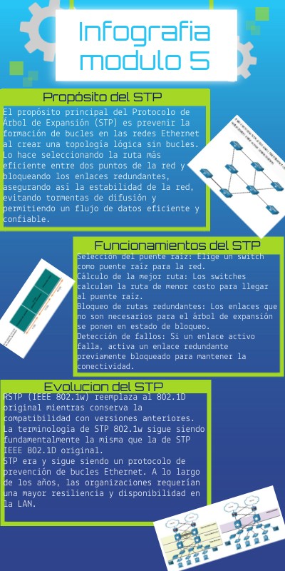 Selección del puente raíz: Elige un switch como puente raíz para la red. Cálculo de la mejor ruta: Los switches calculan la ruta de menor costo para llegar al puente raíz. Bloqueo de rutas redundantes: Los enlaces que no son necesarios para el árbol de expansión se ponen en estado de bloqueo. Detección de fallos: Si un enlace activo falla, activa un enlace redundante previamente bloqueado para mantener la conectividad.