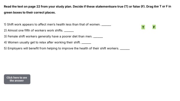 Read the text on page 22 from your study plan. Decide if these statementsare true (T) or false (F). Drag the T or F in green boxes to their correct places. 1) Shift work appears to affect men’s health less than that of women. _______ 2) Almost one fifth of workers work shifts. _______ 3) Female shift workers generally have a poorer diet than men. _______ 4) Women usually get to relax after working their shift. _______ 5) Employers will benefit from helping to improve the health of their shift workers. _______