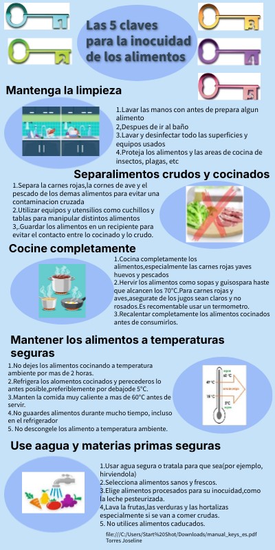 1.lava tus manos antes de empezar a manipular los alinementos y hazlo frecuentementemientras cocinas o preparas.2.Asegurate lavar las manos si tocas algo que pueda afectar los alimentos o la salud. 3.Limpia y desinfecta todas las superficies que utimices al cocinar. 4.Manten los alimentos y la cocina protegidos de isectos, plagas y animales.