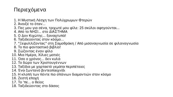 Εκείνη την εισπνοή του Ιουλίου γινόταν στο νησί μια έκθεση βιβλίου στην Πινακοθήκη , όπου ήταν καλεσμένοι διάσημοι συγγραφείς από την Ελλάδα και τον κόσμο. Τα παιδιά λαχταρούσαν να πάνε για να γνωρίσουν τους συγγραφείς από κοντά και να πάρουν λίγο από την έμπνευσή τους.