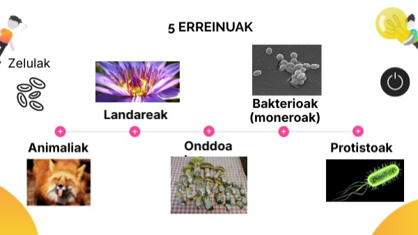 - Zelula eukariotoen barruan erreinu hauek sartzen dira: animaliak,landareak,onddoak eta protistoak.