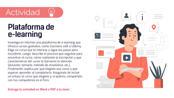 Investiga en internet una plataforma de e-learning que ofrezca cursos gratuitos, como Coursera, edX o Udemy. Elige un curso que te interese y sigue los pasos para inscribirte. Luego, describe el proceso que seguiste para encontrar el curso, cómo realizaste la inscripción y qué características del curso te llamaron la atención (duración, temario, método de enseñanza, etc.). Finalmente, explica por qué elegiste ese curso y qué esperas aprender al completarlo. Asegúrate de incluir un enlace al curso que elegiste y, si quieres, compártelo con tus compañeros en el foro.