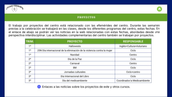 El trabajo por proyectos del centro está relacionado con las efemérides del centro. Durante las semanas previas a la celebración se trabajará en las clases, desde los diferentes programas del centro, estas fechas. En el enlace de abajo se podrán ver las noticias en la web relacionadas con estas fechas, abordadas desde una perspectiva interdisciplinar. Las actividades complementarias del centro también se trabajan por proyectos.