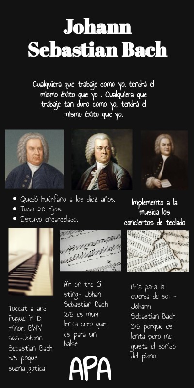 Youtube: https://youtu.be/GMkmQlfOJDk. https://youtu.be/PCpFeOhRf2Q https://youtu.be/ho9rZjlsyYY Biografia:Johann Sebastian Bach. (s. f.). Biografiasyvidas.com. Recuperado 31 de octubre de 2024, de https://www.biografiasyvidas.com/biografia/b/bach_sebastian.htm Frase:Johann Sebastian Bach quotes (author of the well-tempered clavier). (s. f.). Translate.Goog. Recuperado 31 de octubre de 2024, de https://www-goodreads-com.translate.goog/author/quotes/115200.Johann_Sebastian_Bach?_x_tr_sl=en&_x_tr_tl=es&_x_tr_hl=es&_x_tr_pto=rq Datos Curiosos:Cano, A. (2024, julio 28). 8 anécdotas curiosas sobre Bach que te contamos en el aniversario de su muerte. Hinves Pianos. https://hinves.com/blog/8-anecdotas-curiosas-sobre-bach-que-te-contamos-en-el-aniversario-de-su-muerte/ Aportaciones a la musica:Deutsche Welle. (2007, abril 17). Johann Sebastian Bach. Deutsche Welle. https://www.dw.com/es/johann-sebastian-bach/a-2445042