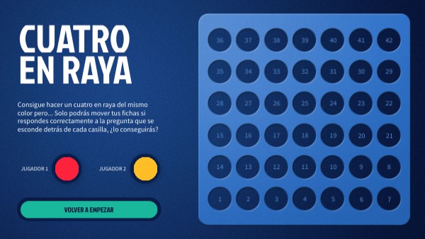 Consigue hacer un cuatro en raya del mismo color pero... Solo podrás mover tus fichas si respondes correctamente a la pregunta que se esconde detrás de cada casilla, ¿lo conseguirás?