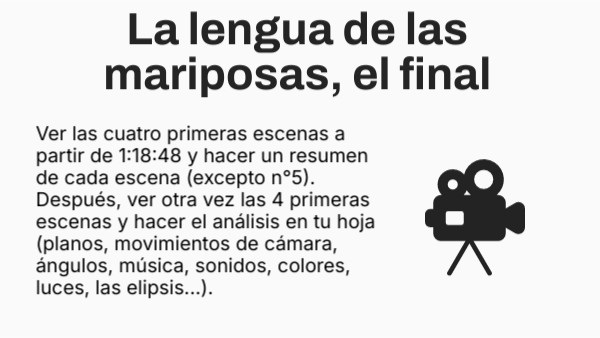 Ver las cuatro primeras escenas a partir de 1:18:48 y hacer un resumen de cada escena (excepto n°5). Después, ver otra vez las 4 primeras escenas y hacer el análisis en tu hoja (planos, movimientos de cámara, ángulos, música, sonidos, colores, luces, las elipsis...).