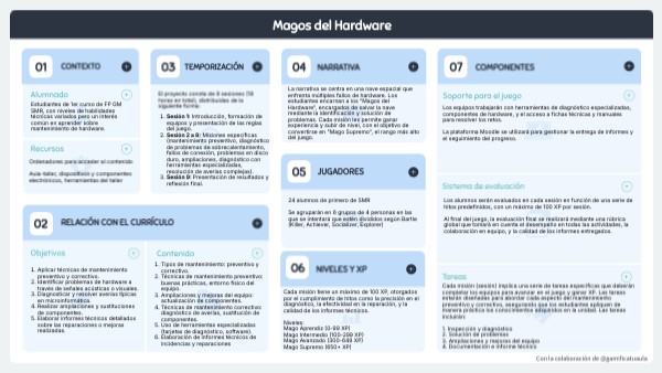 Cada misión tiene un máximo de 100 XP, otorgados por el cumplimiento de hitos como la precisión en el diagnóstico, la efectividad en la reparación, y la calidad de los informes técnicos. Niveles: Mago Aprendiz (0-99 XP) Mago Intermedio (100-299 XP) Mago Avanzado (300-649 XP) Mago Supremo (650+ XP)
